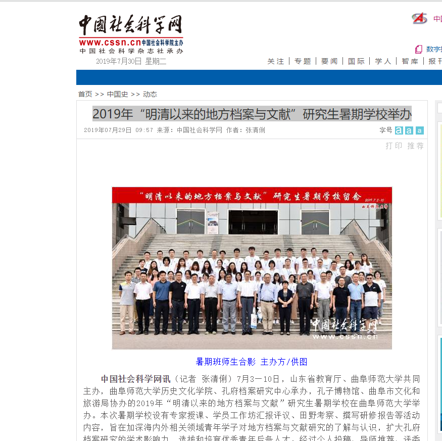 中国社会科学网:2019年“明清以来的地方档案与文献”研究生暑期学校举办