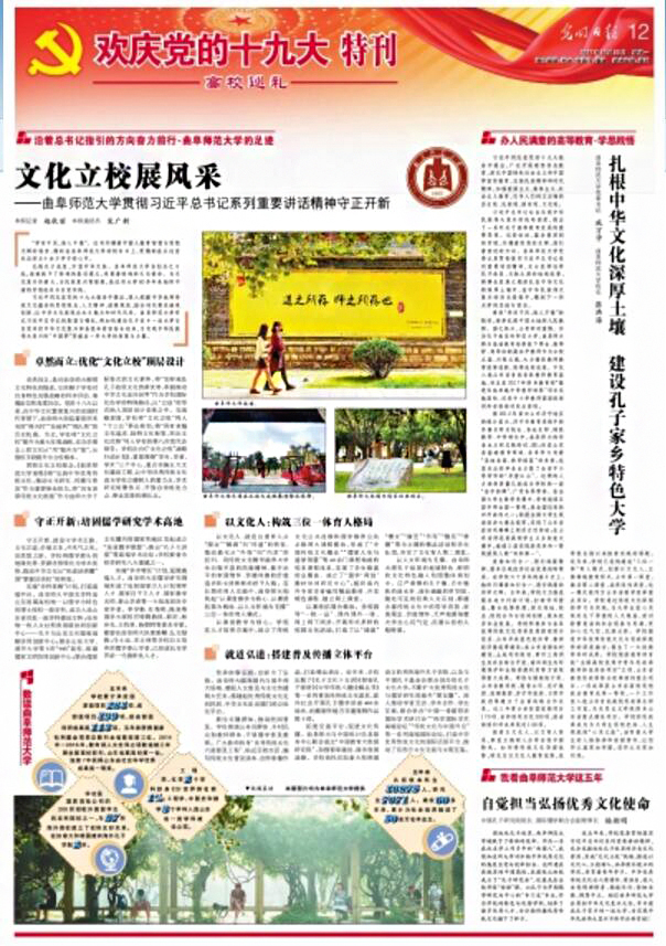 “办人民满意的高等教育·学思践悟”部分发表了学校党委书记戚万学、校长张洪海的署名文章《扎根中华文化深厚土壤 建设孔子家乡特色大学》,文章结合认真学习习近平总书记在党的十九大所作的报告、深刻领会习近平总书记提出的一系列关于高等教育发展的重要思想,阐述了学校如何充分发挥设学孔子故里、文脉之源的地域优势,在中华民族伟大复兴的历史进程中贡献出一所大学的忠诚与担当。