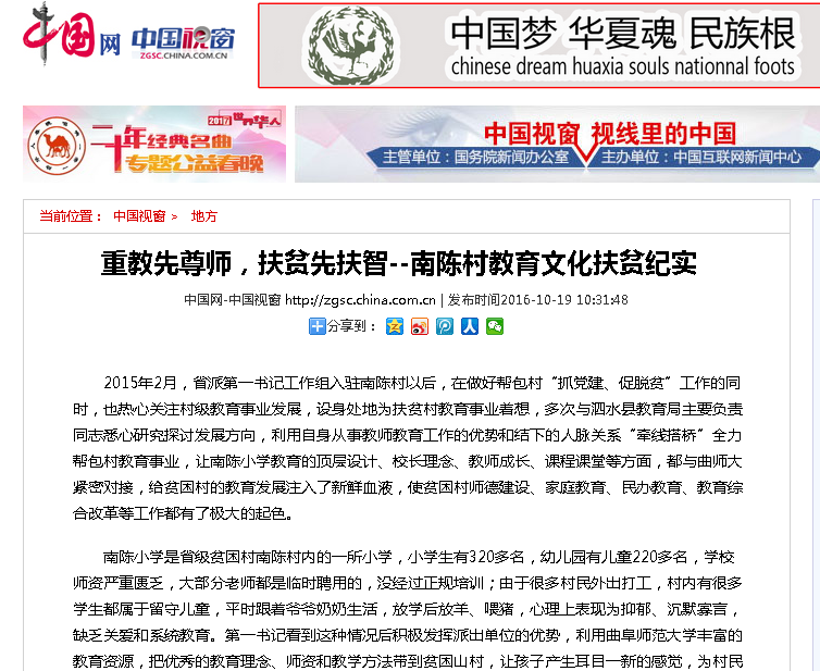 中国网:重教先尊师 扶贫先扶智—南陈村教育文化扶贫纪实