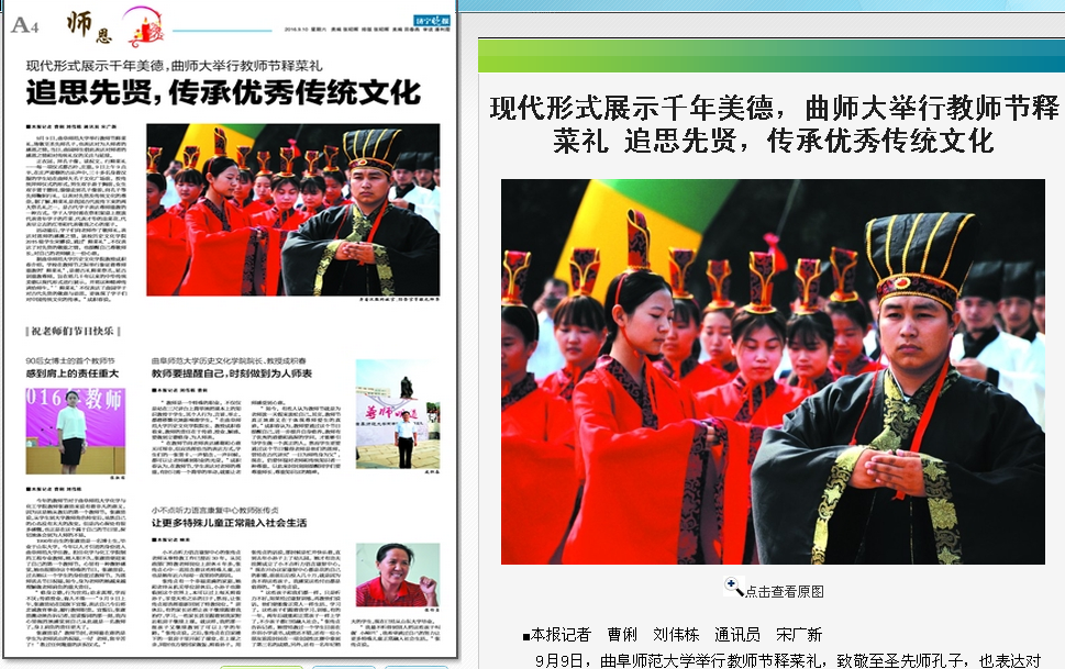 济宁晚报《曲师大释菜礼追思先贤  传承优秀传统文化》:http://epaper.jn001.com/jnwb/html/2016-09/10/content_175474.htm