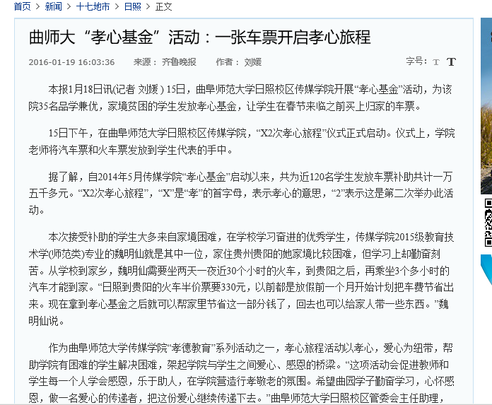 齐鲁晚报:曲师大“孝心基金”活动:一张车票开启孝心旅程