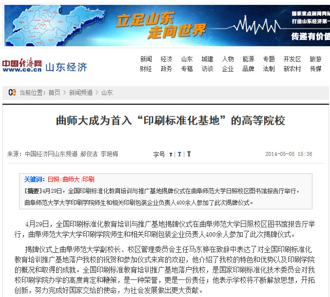 中国经济网:曲师大成为首入“印刷标准化基地”的高等院校