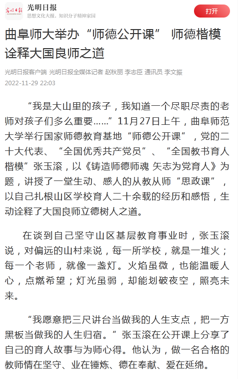 【光明日报】曲阜师大举办“师德公开课” 师德楷模诠释大国良师之道