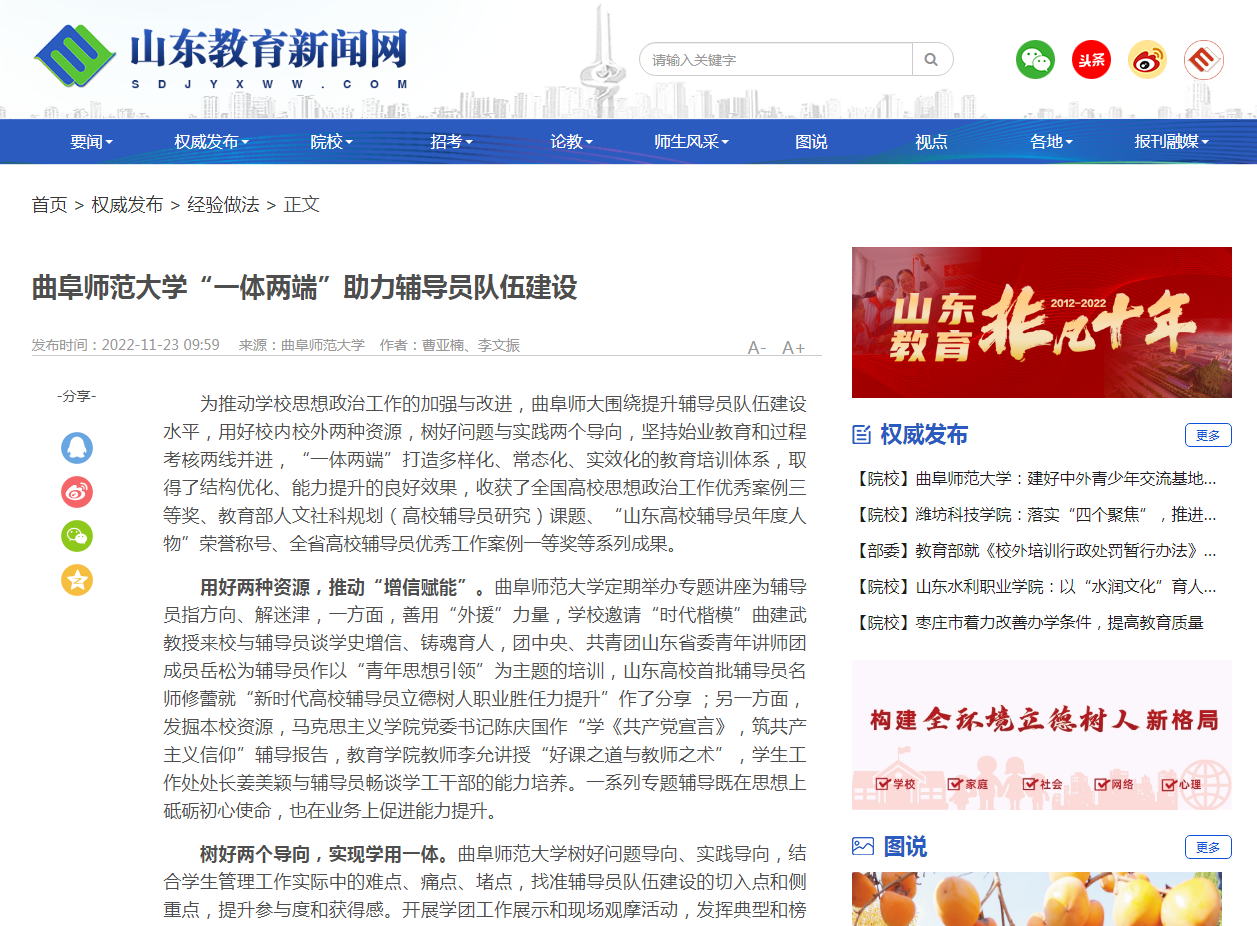 【山东教育新闻网】开元足球_开元(中国)“一体两端”助力辅导员队伍建设