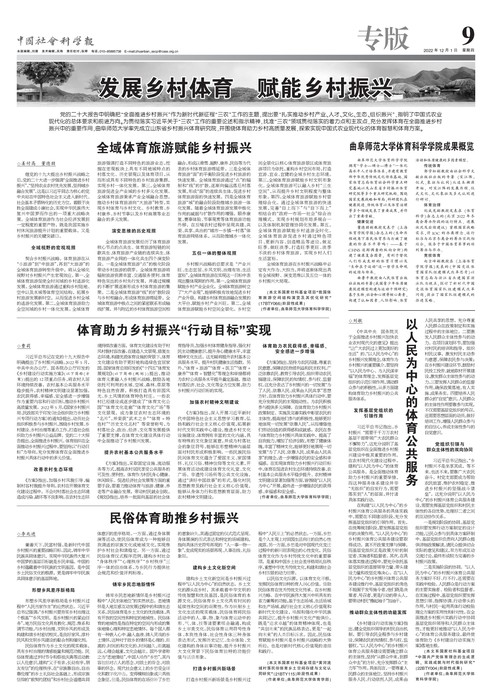 曲阜师大体育科学学院讯 日前,中国社会科学报在“发展乡村体育、赋能乡村振兴”专版中刊登了开元足球_开元(中国)山东省乡村振兴体育研究院执行副院长曹莉教授团队的系列成果,其内容包括:体育助力乡村振兴“行动目标”、构建以人民为中心的体育公共服务、全域体育旅游赋能乡村振兴、民俗体育助推乡村振兴等主题的阶段性战略研究。报道还对学校体育科学学院近年来取得的相关成绩进行了列举,相关科研成果为全国农村体育发展提供理论依据和现实借鉴,标志着团队的研究在乡村体育领域处于省内领先地位、对全国乡村体育研究形成较大影响。