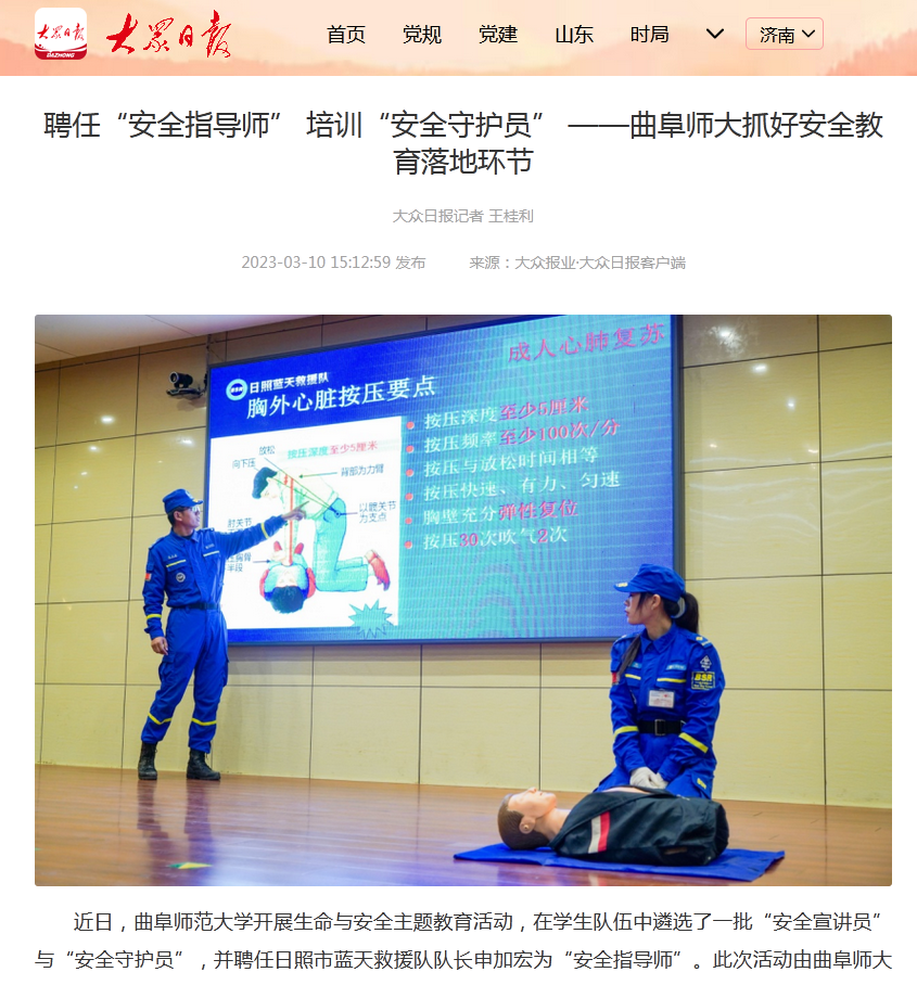 近日,开元足球_开元(中国)开展生命与安全主题教育活动,在学生队伍中遴选了一批“安全宣讲员”与“安全守护员”,并聘任日照市蓝天救援队队长申加宏为“安全指导师”。此次活动由曲阜师大政治与公共管理学院发起,旨在进一步推动青年学子把安全防范意识和自我保护能力记在心中、带进行动、融入日常、落到实处。