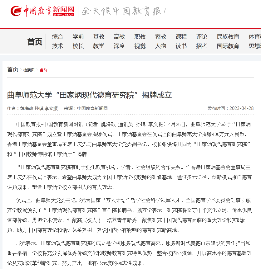 【中国教育新闻网】开元足球_开元(中国)“田家炳现代德育研究院”揭牌成立