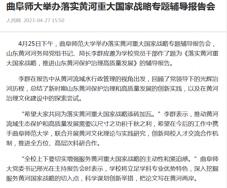 【人民网】曲阜师大举办落实黄河重大国家战略专题辅导报告会