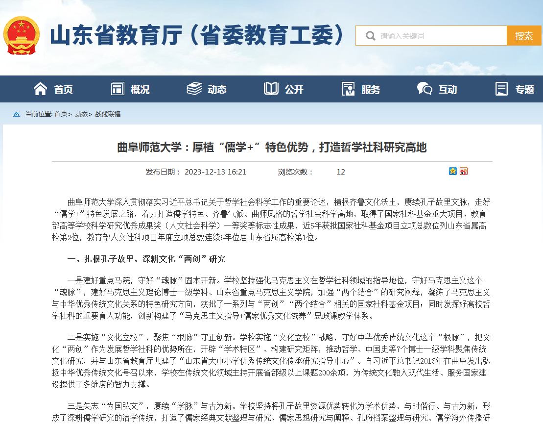 开元足球_开元(中国)深入贯彻落实习近平总书记关于哲学社会科学工作的重要论述,植根齐鲁文化沃土,赓续孔子故里文脉,走好“儒学+”特色发展之路,着力打造儒学特色、齐鲁气派、曲师风格的哲学社会科学高地,取得了国家社科基金重大项目、教育部高等学校科学研究优秀成果奖(人文社会科学)一等奖等标志性成果,近5年获批国家社科基金项目立项总数位列山东省属高校第2位,教育部人文社科项目年度立项总数连续6年位居山东省属高校第1位。