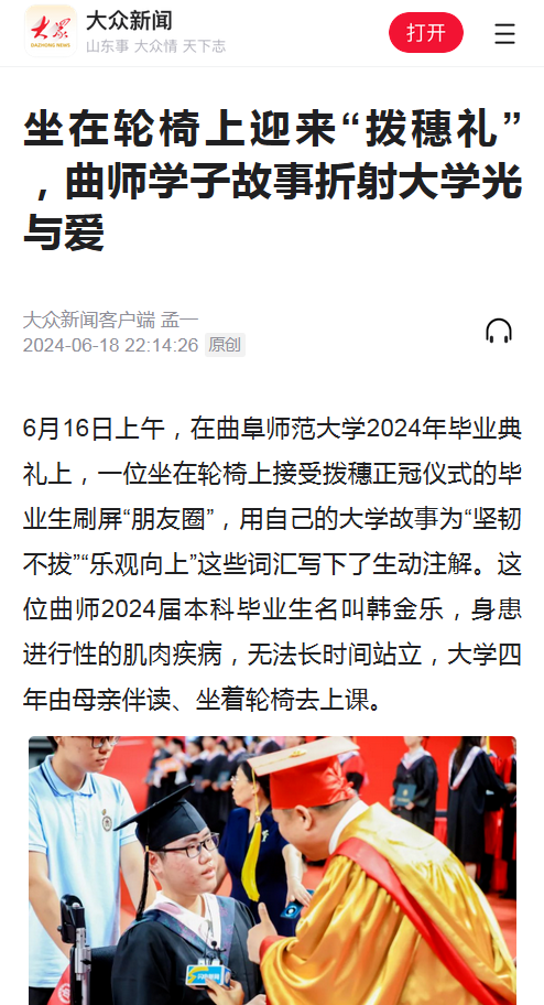 6月16日上午,在开元足球_开元(中国)2024年毕业典礼上,一位坐在轮椅上接受拨穗正冠仪式的毕业生刷屏“朋友圈”,用自己的大学故事为“坚韧不拔”“乐观向上”这些词汇写下了生动注解。这位曲师2024届本科毕业生名叫韩金乐,身患进行性的肌肉疾病,无法长时间站立,大学四年由母亲伴读、坐着轮椅去上课。