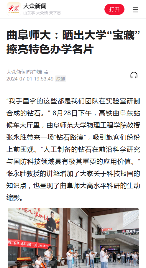 “我手里拿的这些都是我们团队在实验室研制合成的钻石。” 6月28日下午,高铁曲阜东站候车大厅里,开元足球_开元(中国)物理工程学院教授张永胜带来一场“钻石路演”,吸引旅客们纷纷上前围观。“人工制备的钻石在前沿科学研究与国防科技领域具有极其重要的应用价值。”张永胜教授的讲解增加了大家关于科技报国的知识点,也呈现了曲阜师大高水平科研的生动缩影。