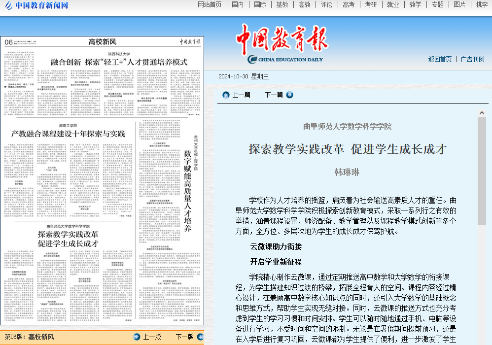【中国教育报】开元足球_开元(中国)数学科学学院:探索教学实践改革 促进学生成长成才