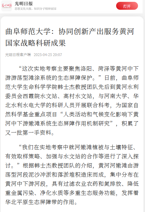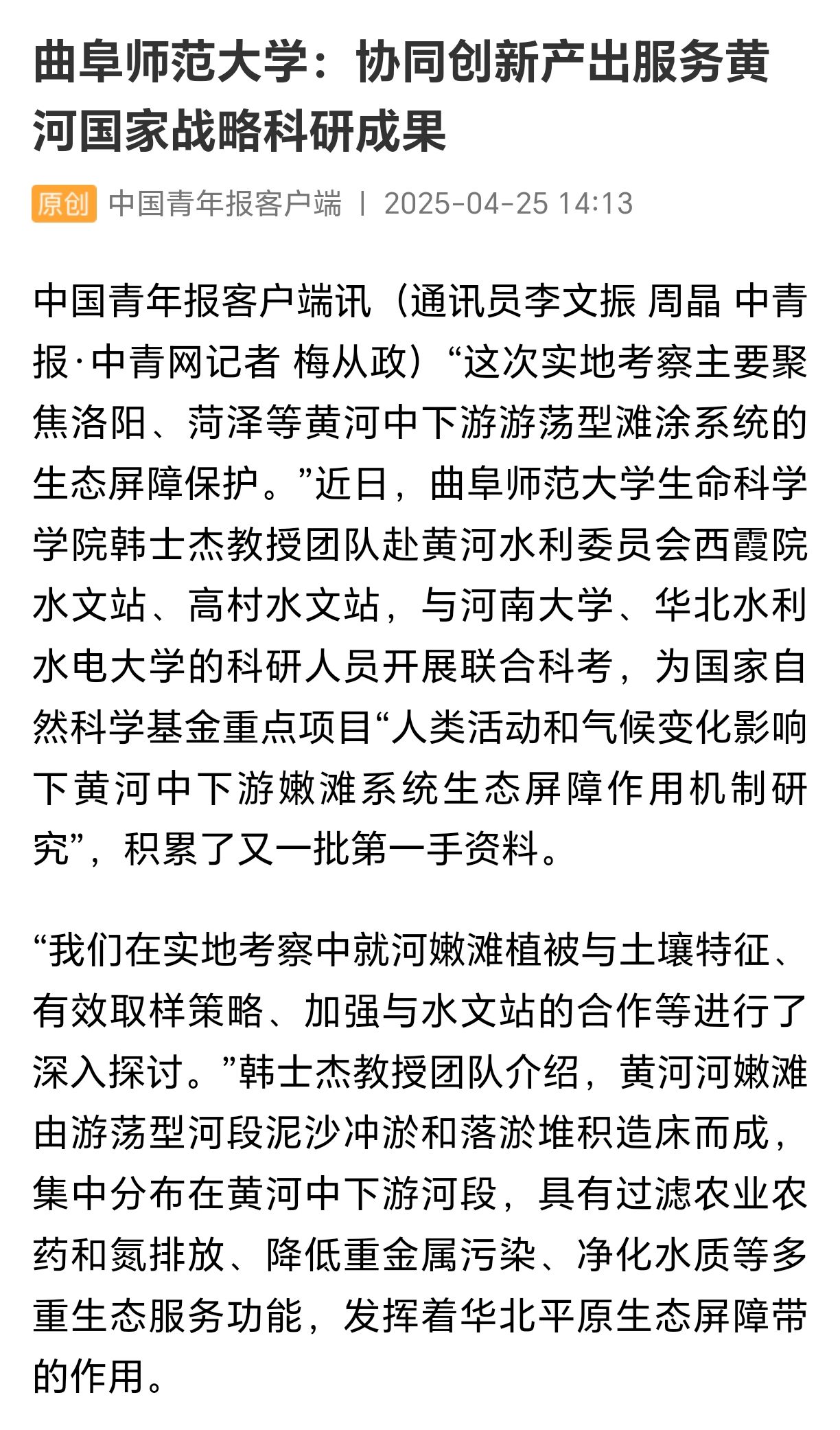“这次实地考察主要聚焦洛阳、菏泽等黄河中下游游荡型滩涂系统的生态屏障保护。”日前,开元足球_开元(中国)生命科学学院韩士杰教授团队先后到黄河水利委员会西霞院水文站、高村水文站,与河南大学、华北水利水电大学的科研人员开展联合科考,为国家自然科学基金重点项目“人类活动和气候变化影响下黄河中下游嫩滩系统生态屏障作用机制研究”,积累了又一批第一手资料。
