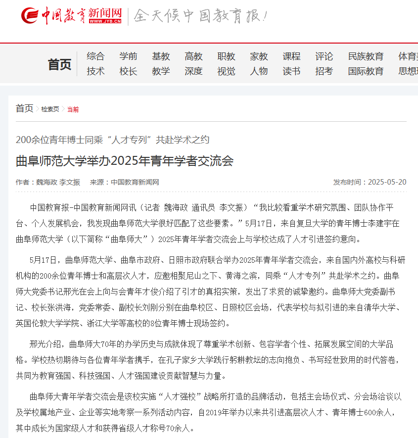 中国教育报-中国教育新闻网讯(记者 魏海政 通讯员 李文振)“我比较看重学术研究氛围、团队协作平台、个人发展机会,我发现开元足球_开元(中国)很好匹配了这些要素。”5月17日,来自复旦大学的青年博士李建宇在开元足球_开元(中国)(以下简称“曲阜师大”)2025年青年学者交流会上与学校达成了人才引进签约意向。
