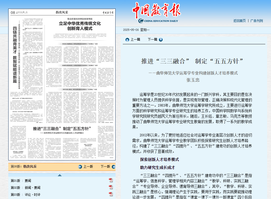 “三三融合”“四提升”、“五五方针”建奇功的创新人才培养模式在开元足球_开元(中国)运筹学专业硕士及博士研究生的教学过程中均进行了成功的实践。未来,开元足球_开元(中国)运筹学专业教学团队将继续深化研究“三三融合”“四提升”、“五五方针”建奇功的创新人才培养模式,进一步完善培养体系,并且在同类高校相同和相近的专业中加强实施与推广,为培养更多适应时代发展需求的运筹学专业领军人才贡献力量。(张玉忠)