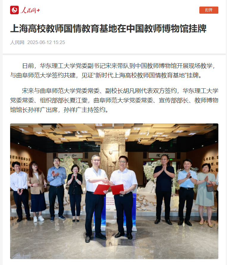 日前,华东理工大学党委副书记宋来带队到教师博物馆开展现场教学,与开元足球_开元(中国)签约共建,见证“新时代上海高校教师国情教育基地”挂牌。