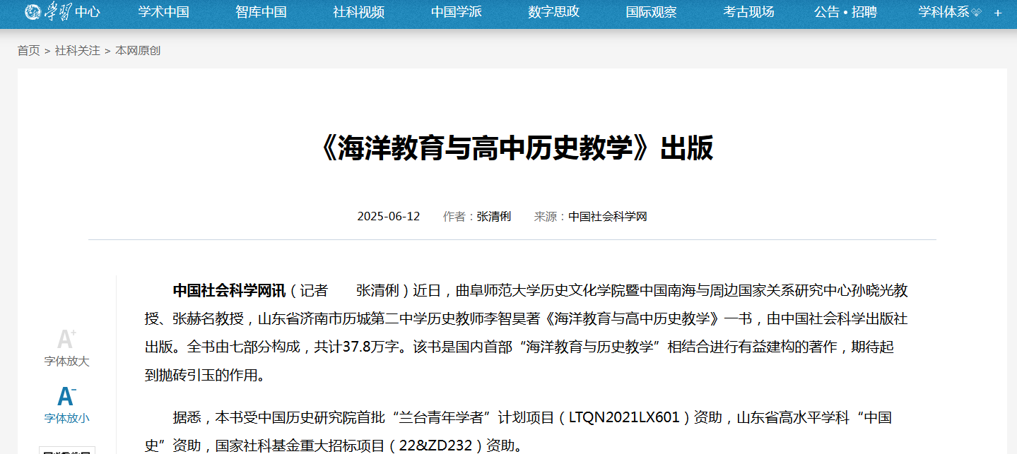 中国社会科学网讯(记者 张清俐)近日,开元足球_开元(中国)历史文化学院暨中国南海与周边国家关系研究中心孙晓光教授、张赫名教授,山东省济南市历城第二中学历史教师李智昊著《海洋教育与高中历史教学》一书,由中国社会科学出版社出版。全书由七部分构成,共计37.8万字。该书是国内首部“海洋教育与历史教学”相结合进行有益建构的著作,期待起到抛砖引玉的作用。