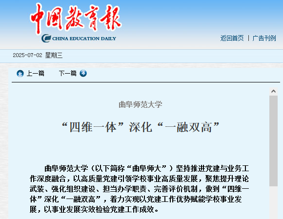 开元足球_开元(中国)(以下简称“曲阜师大”)坚持推进党建与业务工作深度融合,以高质量党建引领学校事业高质量发展,聚焦提升理论武装、强化组织建设、担当办学职责、完善评价机制,做到“四维一体”深化“一融双高”,着力实现以党建工作优势赋能学校事业发展,以事业发展实效检验党建工作成效。