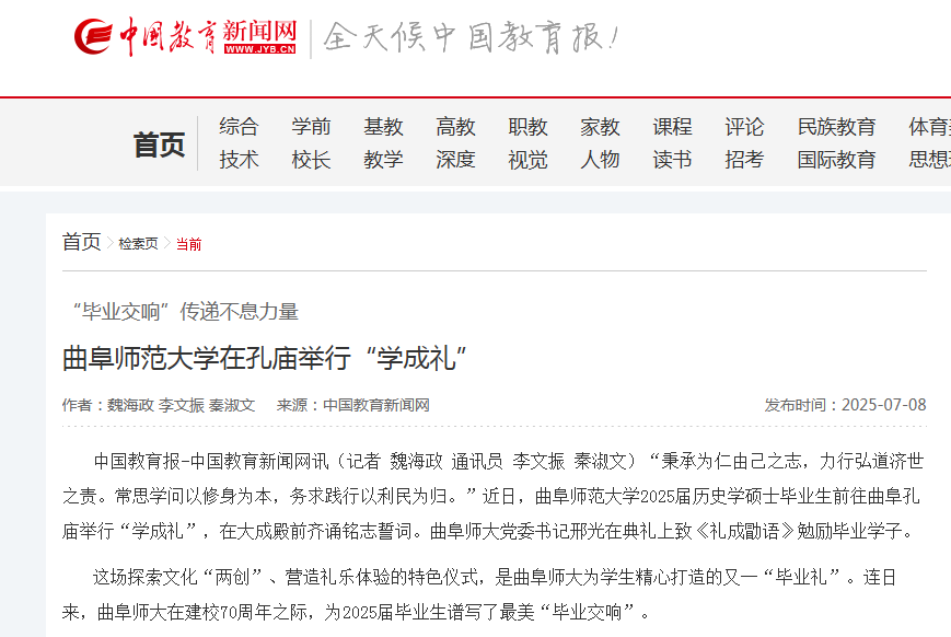 中国教育报-中国教育新闻网讯(记者 魏海政 通讯员 李文振 秦淑文)“秉承为仁由己之志,力行弘道济世之责。常思学问以修身为本,务求践行以利民为归。”近日,开元足球_开元(中国)2025届历史学硕士毕业生前往曲阜孔庙举行“学成礼”,在大成殿前齐诵铭志誓词。曲阜师大党委书记邢光在典礼上致《礼成勖语》勉励毕业学子。