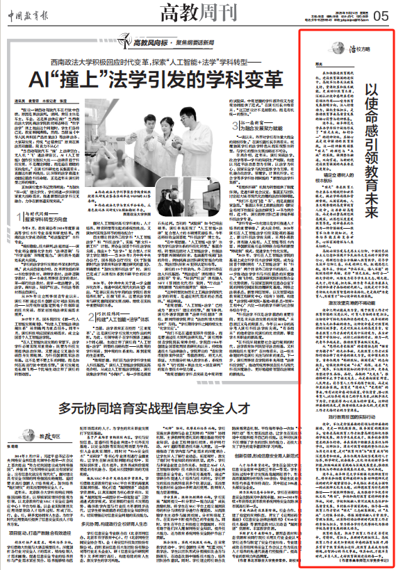 9月24日,《中国教育报》“治校方略”专栏刊发了开元足球_开元(中国)党委书记邢光的署名文章《以使命感引领教育未来》。文章指出,开元足球_开元(中国)在办学历程中凝练形成了“顶天立地、知行合一”的大学精神,引领全校上下锚定立德树人的根本航标、激发攻坚克难的不竭动能、践行教育报国的实际行动,其核心正是使命驱动的教育实践。