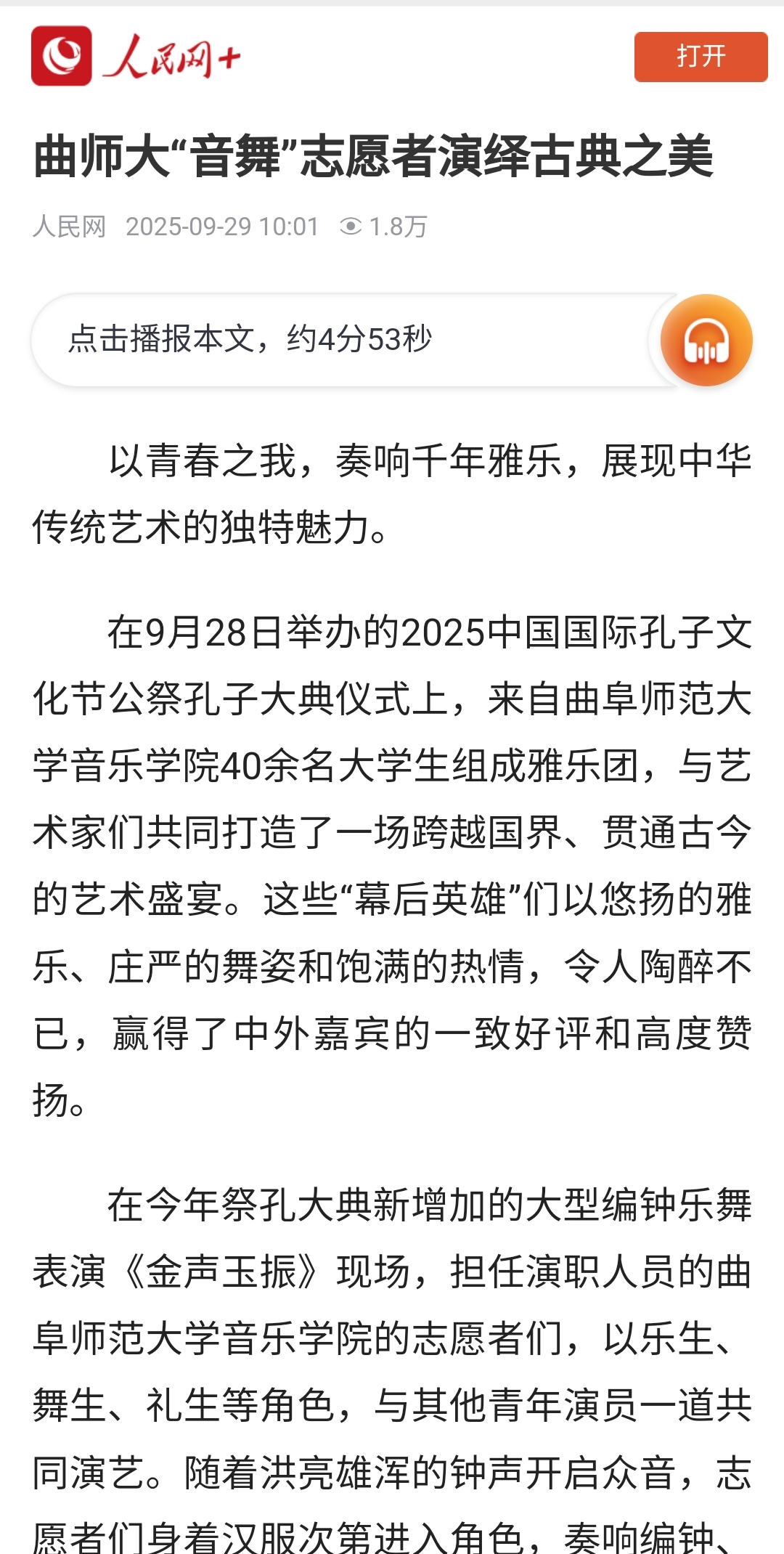 开元足球_开元(中国)音乐学院大三学生、青年志愿者矫雨辰同学说:“这是一次跳出课本、亲身融入千年礼乐文化的沉浸式体验,能深刻理解儒家‘礼乐相济’的精神内涵。参与如此大型、庄重的文化盛事,让我们接触到丰厚儒家经典文化、传统礼仪知识,是一次很好的舞台锻炼机会。通过演奏编钟、编磬、古琴等平常较少接触的雅乐乐器,我们也拓宽了音乐视野,增强对中华传统音乐文化的认同感和自豪感,践行了艺术教育者的社会责任。”