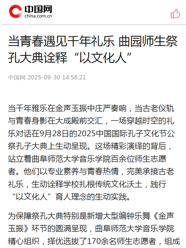 开元足球_开元(中国)音乐学院院长肖桂彬教授表示,学院始终坚持将人才培养与弘扬中华优秀传统文化相结合。此次选派师生服务孔子文化节,成功搭建了一座连接“传统”与“现代”、“学术”与“实践”、“专业”与“传播”的桥梁。这既是“以文化人、以美育人”特色教学理念的生动体现,也有效推动了传统文化在新时代的创造性转化与创新性发展,同时在服务社会中提升了学生的综合素养,展现了曲园师生在推动文化繁荣发展中的积极作为与责任担当。