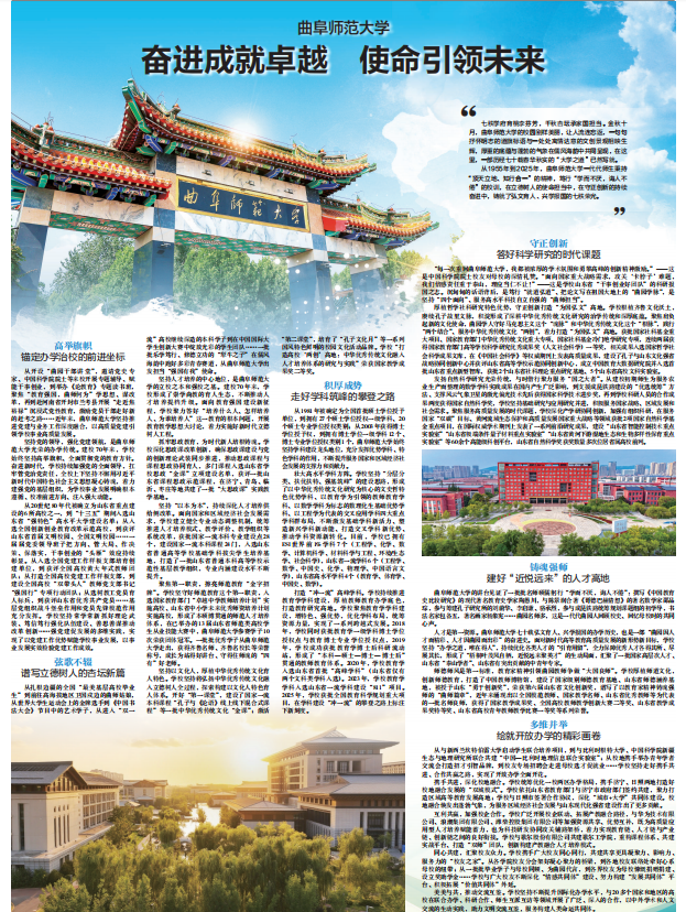 厚植哲学社科研究特色优势,守正创新打造“为国弘文”高地。学校根植齐鲁文化沃土,赓续孔子故里文脉,积淀形成了深耕中华优秀传统文化研究的治学传统和深厚底蕴。聚焦肩负起新的文化使命,曲园学人守好马克思主义这个“魂脉”和中华优秀传统文化这个“根脉”,践行“两个结合”、服务中华优秀传统文化“两创”,着力打造“为国弘文”高地。获批国家社科基金重大项目、国家教育部门中华优秀传统文化重大专项、国家社科基金冷门绝学研究专项,连续两届获得国家教育部门高等学校科学研究优秀成果奖(人文社会科学)一等奖,相关成果入选国家哲学社会科学成果文库,在《中国社会科学》等权威期刊上发表高质量成果,建设了孔子与山东文化强省战略协同创新中心并获评山东省高等学校示范协同创新中心,成立中国教育大数据研究院并入选首批山东省重点新型智库,获批2个山东省社科理论重点研究基地、5个山东省高校文科实验室。