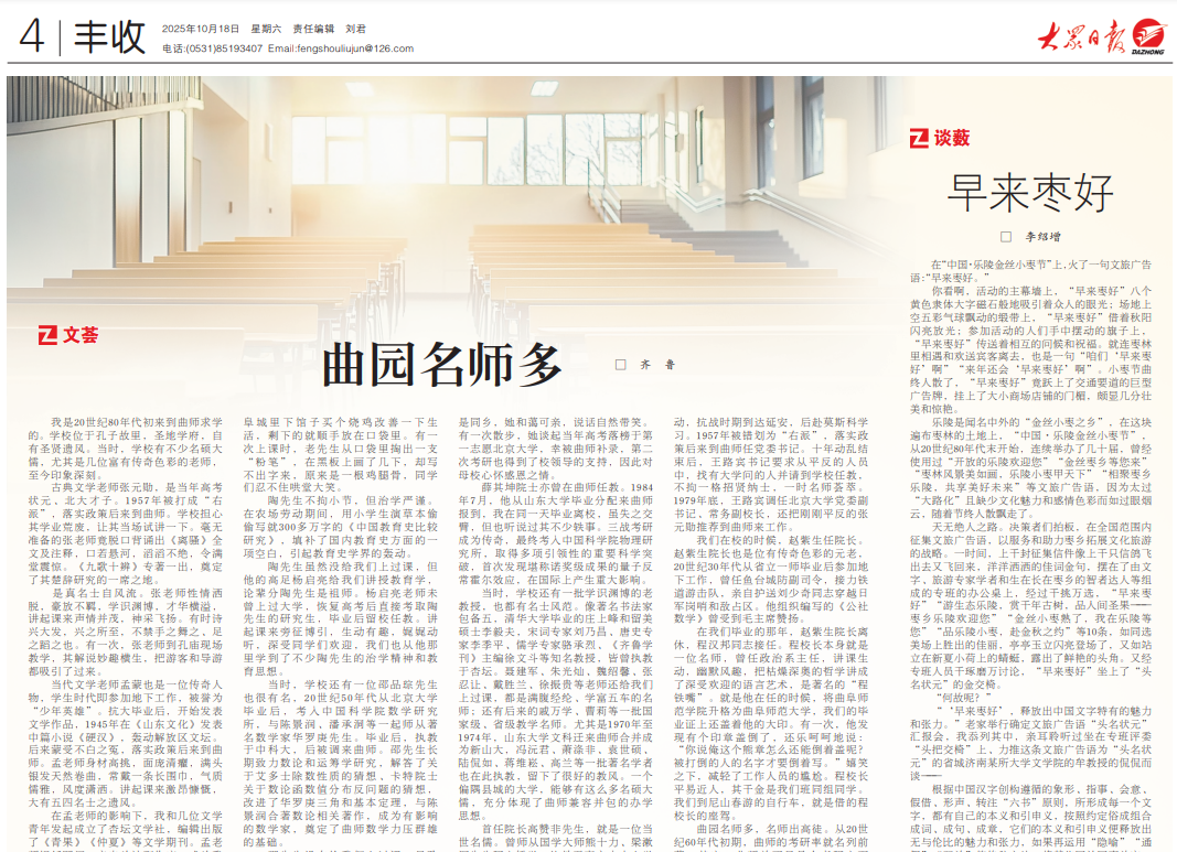 当时,学校还有一批学识渊博的老教授,也都有名士风范。像著名书法家包备五,清华大学毕业的庄上峰和留美硕士李毅夫,宋词专家刘乃昌、唐史专家李季平、儒学专家骆承烈、《齐鲁学刊》主编徐文斗等知名教授,皆曾执教于杏坛。聂建军、朱光灿、魏绍馨、张忍让、戴胜兰、徐振贵等老师还给我们上过课,都是满腹经纶、学富五车的名师;还有后来的戚万学、曹莉等一批国家级、省级教学名师。尤其是1970年至1974年,山东大学文科迁来曲师合并成为新山大,冯沅君、萧涤非、袁世硕、陆侃如、蒋维崧、高兰等一批著名学者也在此执教,留下了很好的教风。一个偏隅县城的大学,能够有这么多名硕大儒,充分体现了曲师兼容并包的办学思想。