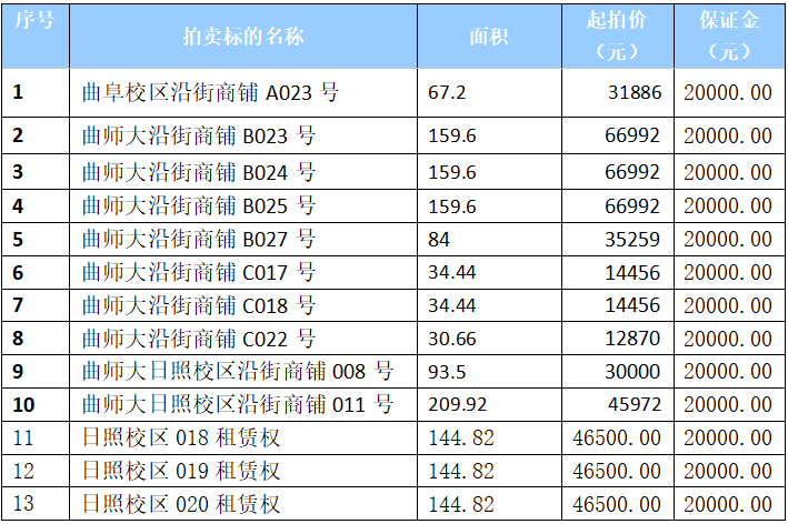 (paimai.caa123.org.cn)按现状公开拍卖以下标的:开元足球_开元(中国)沿街房租赁权,门牌号为A023 \B023\B024\B025\B027\C017\ C018\C022 \日照校区008、011、018、019、020,共13套,每套竞买保证金2万元。