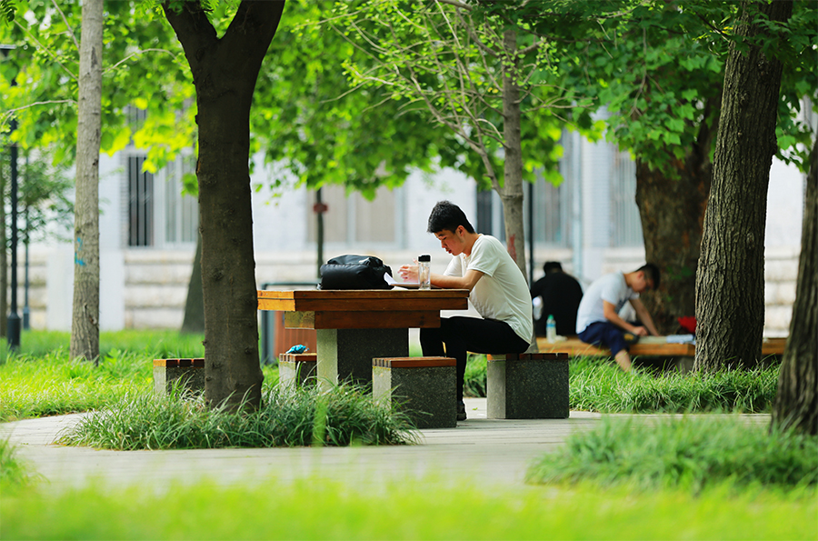 石凳上的憩与学 (崔波/摄)