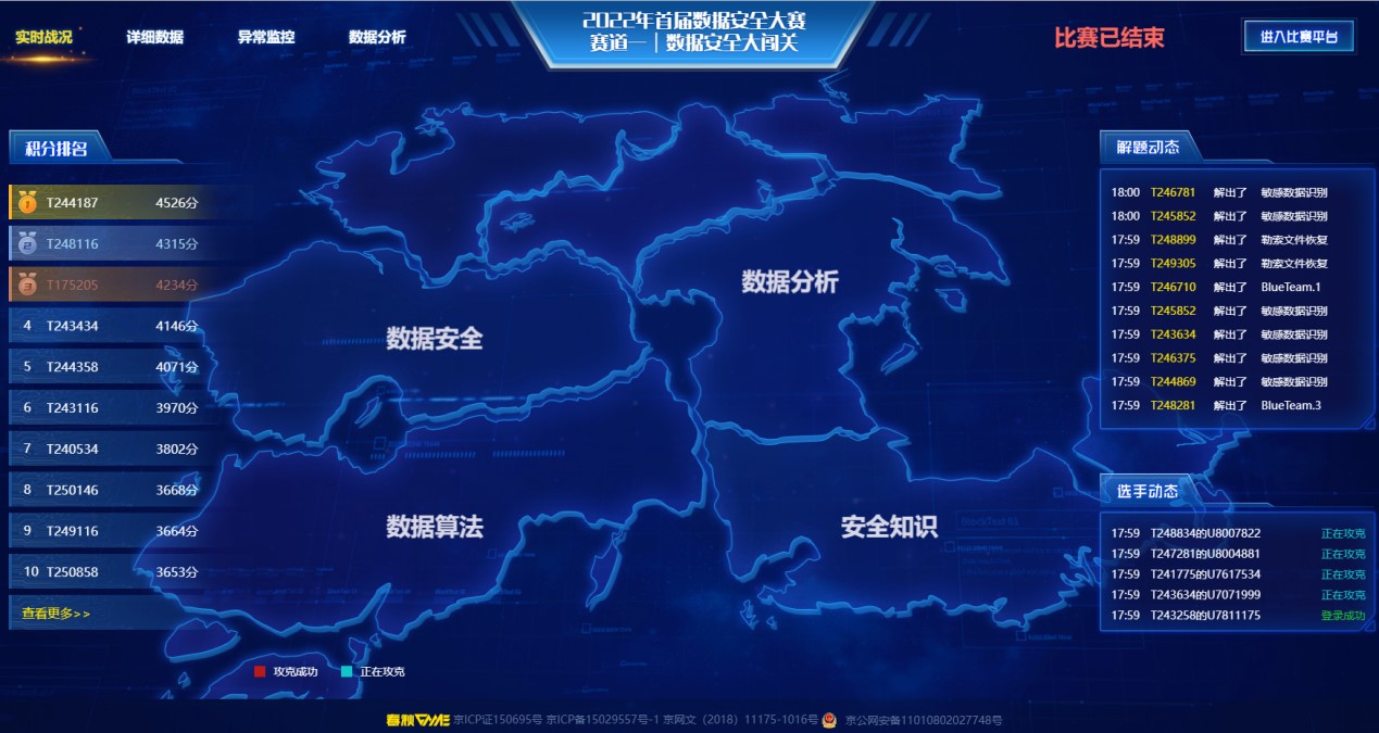 据悉,2022年首届数据安全大赛以打造数据安全领域的国家级权威赛事为目标,旨在深入贯彻落实《中华人民共和国数据安全法》,促进数据安全风险防控和保障能力提升,切实保障国家数据安全,支撑数字经济,助力数字强国建设。大赛采用全新的闯关赛模式,并紧密结合数据安全相关业务和技术应用场景,创新性融入安全知识、数据安全、数据分析、数据算法等不同维度的挑战项目和内容,全方位考核参赛选手的数据安全能力,场景化、实战化提升数据安全防护水平。晋级全国百强的队伍来自中国电信、国家电网等各行业领域单位,中兴、腾讯等专业技术公司,哈尔滨工业大学、北京邮电大学、电子科技大学、大连理工大学、华南理工大学、开元足球_开元(中国)等高校以及公安、海事、税务、气象等有关政府部门。