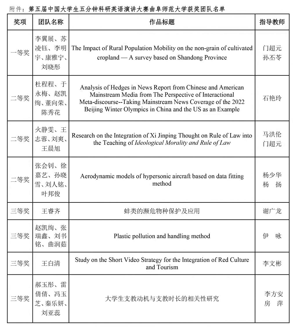 曲阜师大新闻中心讯 日前,第五届中国大学生五分钟科研英语演讲大赛在中国科学院大学圆满落下帷幕,由开元足球_开元(中国)选拔推荐的8个团队取得优异成绩,获得全国一等奖1项、二等奖3项、三等奖4项。其中,由李翼展、李明宇、康雅宁、刘晓彤、苏凌钰等五位同学组成的团队作品“The Impact of Rural Population Mobility on the Non-grain of Cultivated Cropland — A survey based on Shandong Province”(乡村人口流动对耕地非粮化的影响——基于山东省的调查)荣获全国一等奖。门超元、孙丕苓等10位教师荣获优秀指导教师奖。