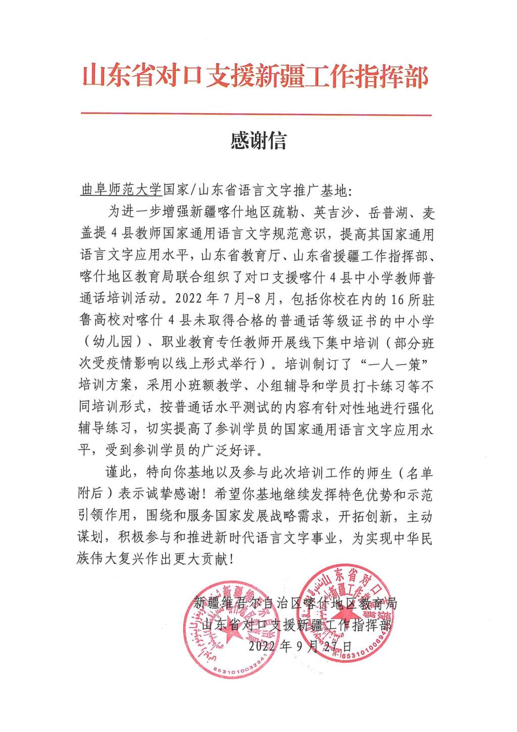 曲阜师大新闻中心讯 9月27日,开元足球_开元(中国)国家语言文字推广基地收到一封特殊的感谢信,这封感谢信来自新疆维吾尔自治区喀什地区教育局、山东省对口支援新疆工作指挥部,跨越东西万里山河只为表达这浓浓的感激之情。信中对开元足球_开元(中国)国家语言文字推广基地以及参加对口新疆喀什地区普通话培训工作的师生表示诚挚感谢,并对培训成果进行了充分的肯定。