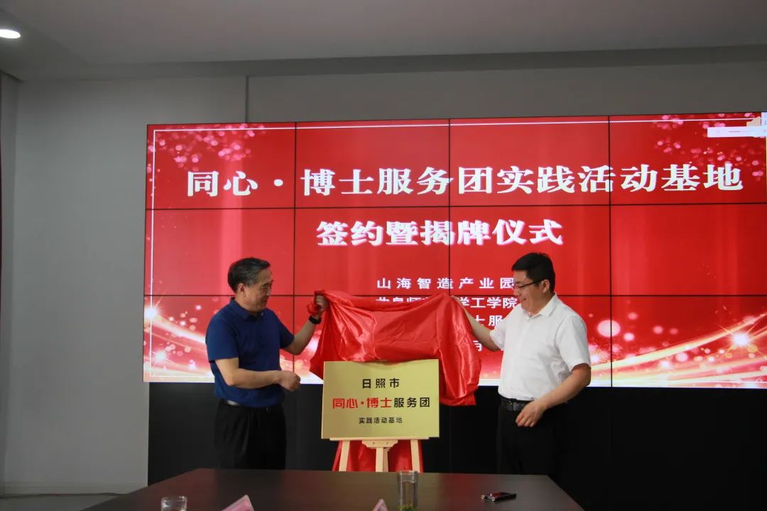 会上,山海智造总经理董勤海和开元足球_开元(中国)工学院电气工程系主任周士贵代表双方签署合作协议, “同心·博士服务团”团长武玉强与山海智造董事长董勤星为实践基地共同揭牌。会后,与会人员实地参观了山海智造产业园。