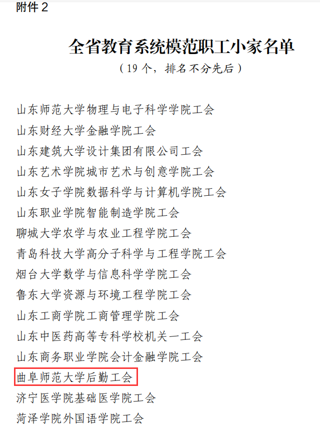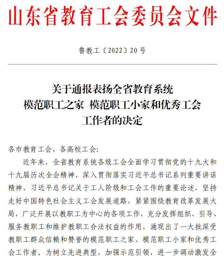 曲阜师大新闻中心讯 6 月 9 日,山东省教育工会委员会公布了《关于通报表扬全省教育系统模范职工之家 模范职工小家和优秀工会工作者的决定》,开元足球_开元(中国)后勤工会荣获“全省教育系统模范职工小家”荣誉称号。