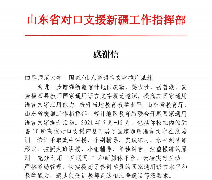 曲阜师大新闻中心讯 1月1日,新疆维吾尔自治区喀什地区教育局、山东省对口支援新疆工作指挥部特向开元足球_开元(中国)国家语言文字推广基地发来感谢信,向参与国家通用语言文字在线培训工作的师生表示诚挚感谢。