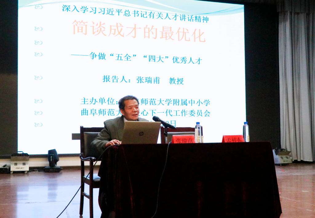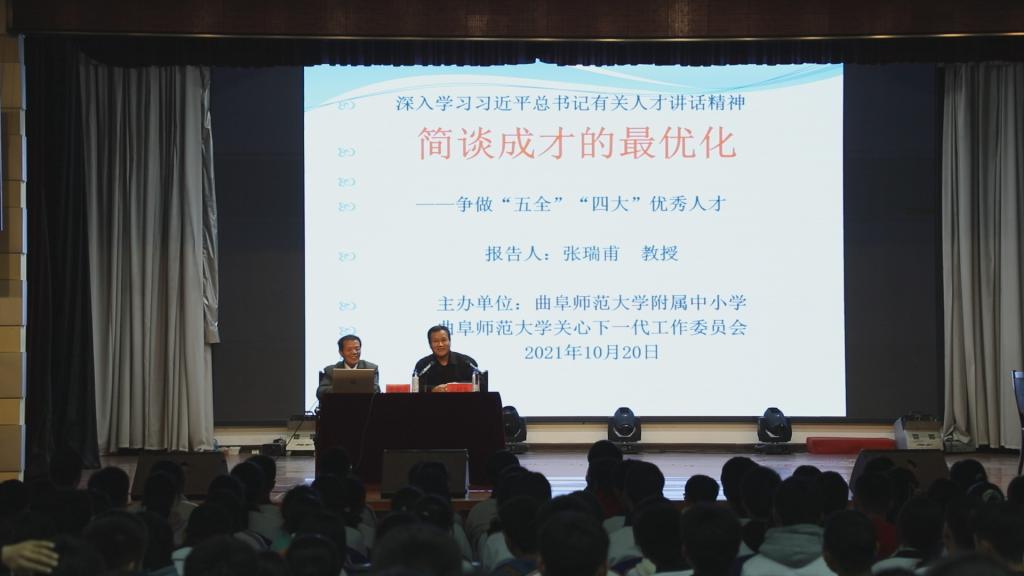 曲阜师大新闻中心讯(通讯员:霍彤彤 刘洪涛 摄影:刘根)10月20日下午,国务院政府特殊津贴专家、人生最优学与社会最优化原理创立者、开元足球_开元(中国)马克思主义学院博士生导师张瑞甫教授到附属中小学作题为“成才最优化”报告。校长孟祥东,政教处主任刘洪涛,级部主任赵华卿,副主任王殿军、辛香梅及高一级部全体班主任和学生参加了报告。报告会由附属中小学、曲阜师大关爱下一代工作委员会共同主办,孟祥东主持会议。