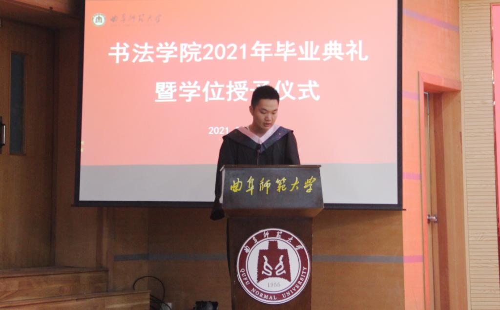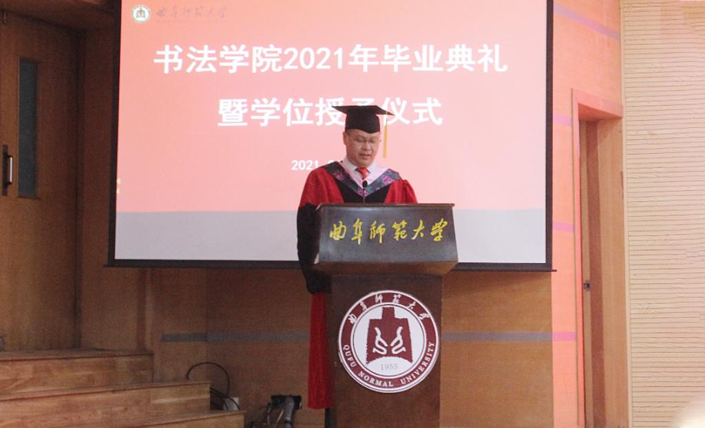 曲阜师大新闻中心讯(通讯员:薛翠)6月26日上午九点,书法学院2021年毕业典礼暨学位授予仪式在我校孔子会堂隆重举行。学院党委书记院长刘建新、副院长陈涛、院长助理乌峰、徐传法,及学院各教研室主任、各年级辅导员、2021届毕业生和在校学生代表共同出席。典礼由学院党委副书记胡乃永主持。