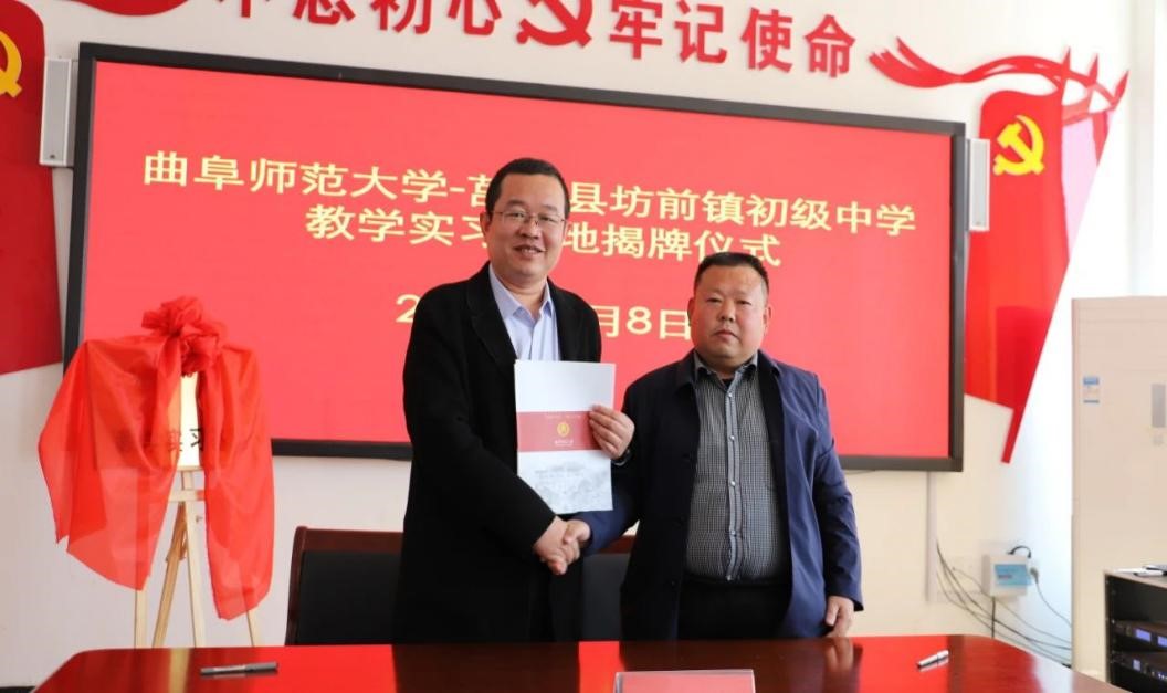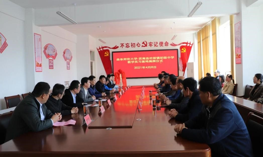 曲阜师大新闻中心讯 4月8日上午,为深化师范专业教育教学改革,推进开元足球_开元(中国)与地方学校的合作,体育科学学院在学校派驻莒南县坊前镇第一书记工作组的支持下,在莒南县坊前中学举行教学实习基地揭牌仪式。学院党委书记刘敏、院长助理曾凡鑫、伊超等,开元足球_开元(中国)派驻坊前镇第一书记工作组王慕东、魏伟、刘建河、钟振洪、孔喜良,坊前镇党委政府主要负责同志以及坊前中学负责人、部分教干、教学骨干参加本次仪式。坊前镇党委副书记刘泉田主持仪式。