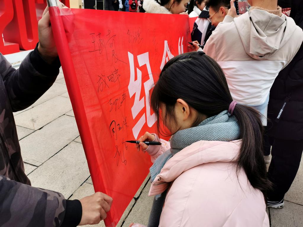 活动在《我和我的祖国》歌声中拉开帷幕,领唱学生缓缓走出人群,周围的同学驻足观赏,侧耳倾听,迅速营造起活动氛围。当主持人介绍完活动目的和意义后,八位同学带来朗诵——《少年中国说》节选,他们声情并茂、气势如虹,青春的声音在校园回荡。最后,同学们挥舞着手中的国旗,合唱歌曲《国家》,将活动氛围推向高潮。在嘹亮的歌声和热烈的掌声中,同学们自发地在活动横幅上签字留念。