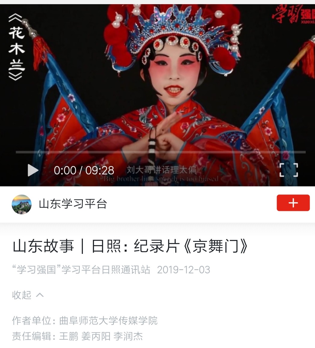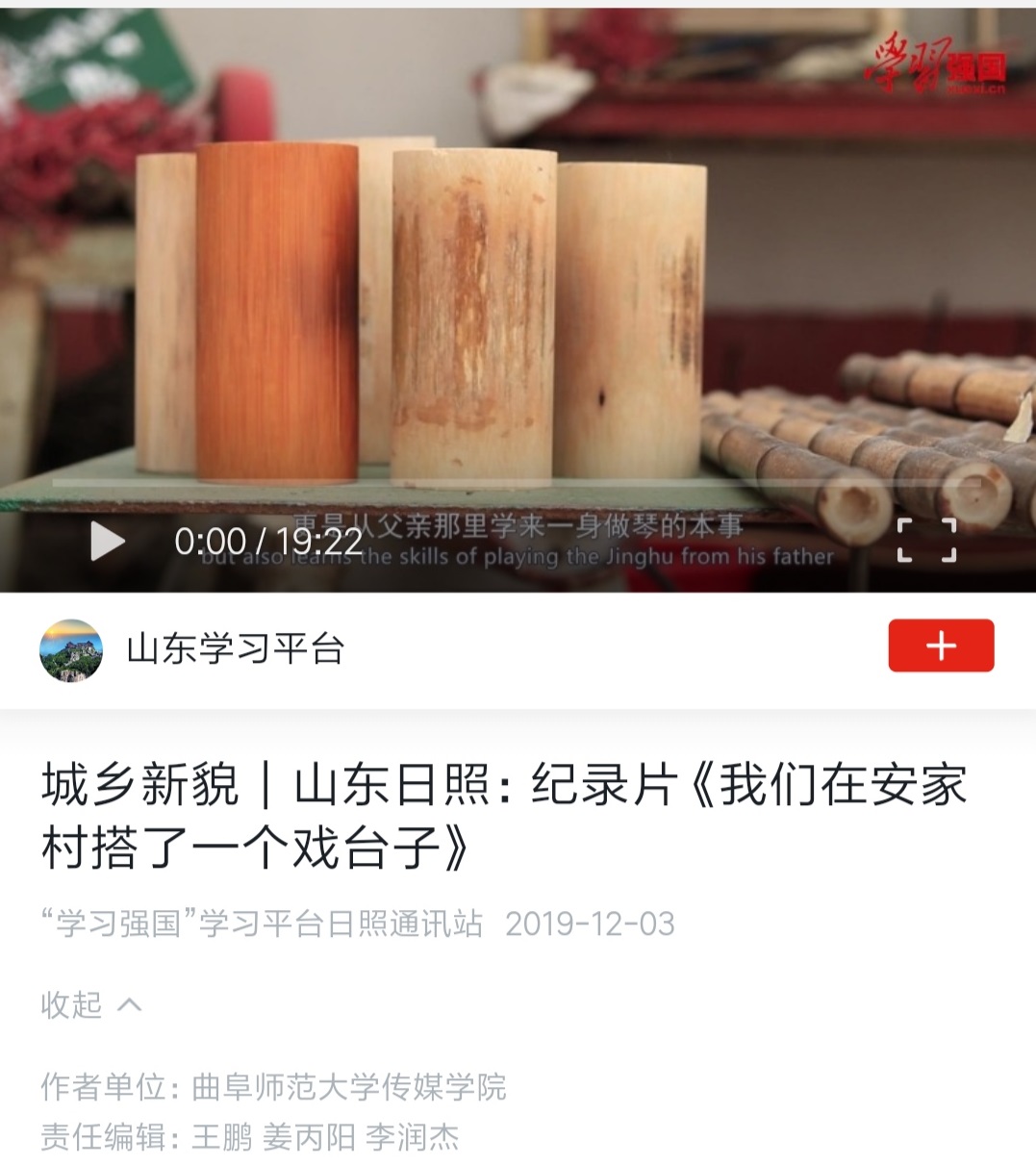 在刘成新、张维刚两位老师的指导下,学院师生拍摄的乡村影像志系列作品《坊前故事》(共6集)在学习强国山东学习平台的“山东故事”栏目展播,该作品同时在人民网视频频道和《求是》杂志社主管的“圆点直播”等多家新媒体平台发布展播。由赵鑫老师指导的纪录片《我们在安家村搭了一个戏台子》《京舞门》分别在学习强国山东学习平台的“城乡新貌”和“山东故事”栏目展播。统计数据显示,上述作品在相关平台的播放量已经超过十万次,产生了比较广泛的反响。