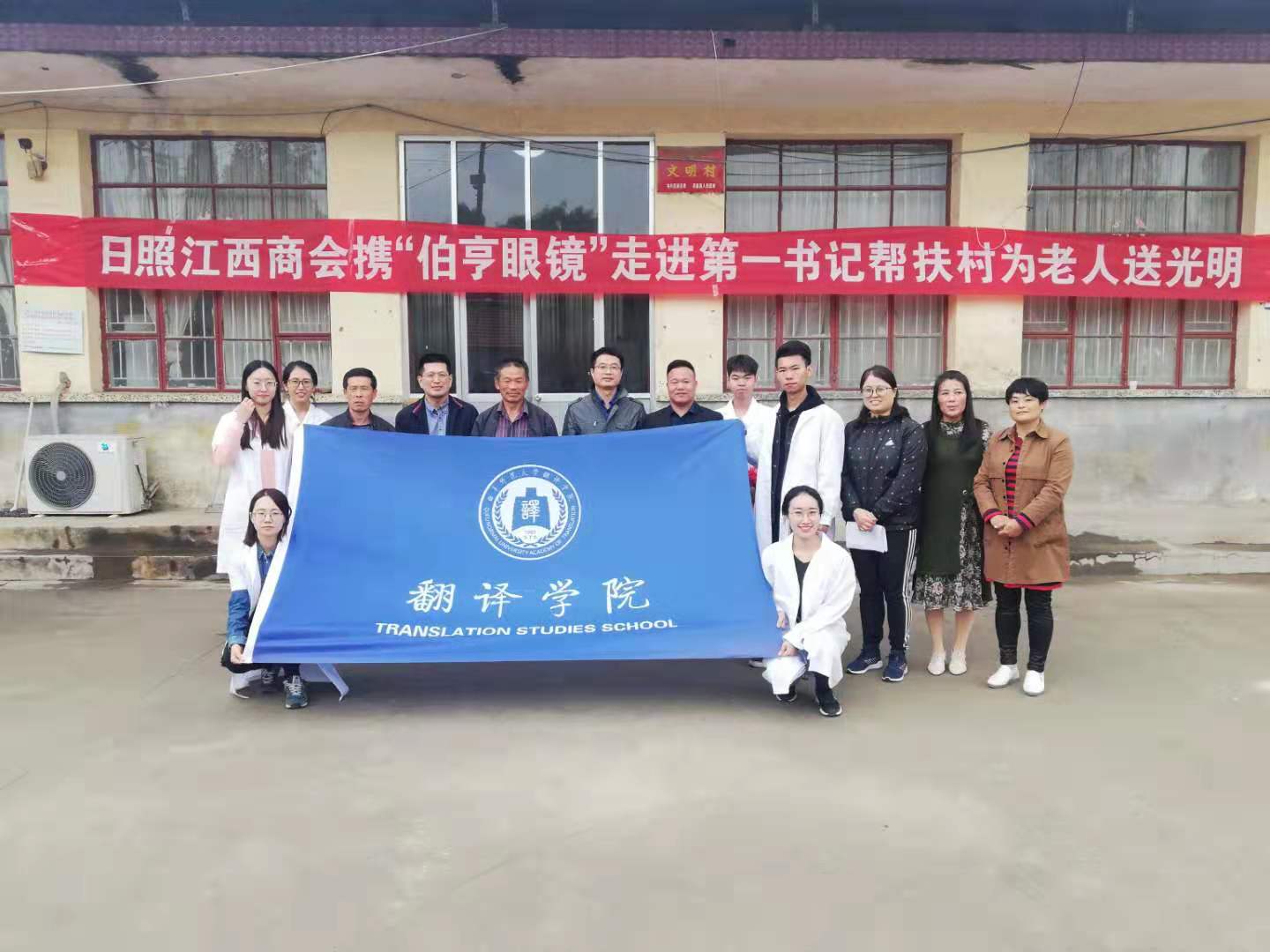由翻译学院部分教工、学生党员,日照市人民医院眼科副主任医师王涛,日照江西商会会长吴小发组成的本次“光明行”志愿服务队为村民们提供了视力检查、眼屈光检查等服务,耐心向村民们科普了老年人视力保健等相关知识,并根据每位老人的视力情况将浓浓的“重阳情”送达到老人手中,老人们面带微笑,乐呵呵地接过山东伯亨眼镜有限公司赞助的老花镜,幸福的笑容洋溢在脸上。整个活动持续了4个多小时,共为150余名老年人提供了服务,共赠送价值1万余元的花镜150副,对诊断出可能患有白内障等眼疾的村民提出了针对性的治疗建议,赢得了村民们一致好评。