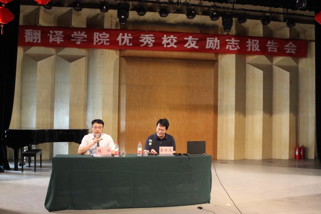 6月12日下午,我校翻译学院优秀校友励志报告会隆重举行。翻译学院特邀杰出校友、深圳恒信创新资本有限公司董事长董洪庆先生回母校,与全体同学分享其学习和创业经历。本次报告会由学院党委书记魏伟主持,学院党委副书记董家忠、工会主席徐凤教授、团委书记岳峰老师、学院办公室主任孙杰琼老师出席此次活动,2017、2018级全体同学聆听了报告会。