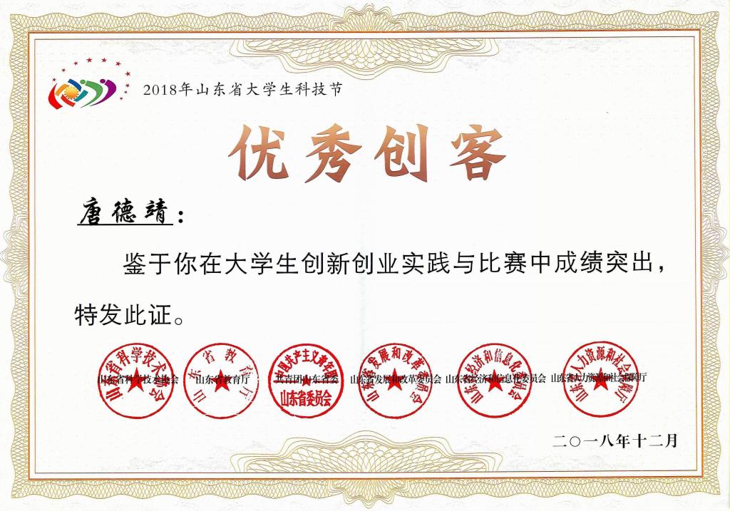 近日,山东省科协公布了2018年山东省大学生优秀创客、优秀科技创新导师、科技节优秀组织单位等一批先进典型,我校信息科学与工程学院团委书记毕文波、2016级学生唐德靖获评山东省优秀科技创新导师和山东省大学生优秀创客。