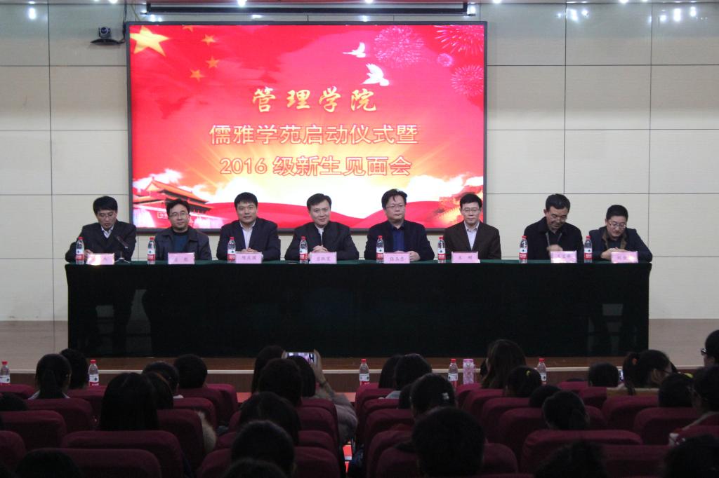 11月18日晚,管理学院儒雅学苑启动仪式暨2016级新生见面会于图书馆报告厅顺利举行。出席此次仪式的领导嘉宾有省人大常委、管理学院院长张玉忠,校团委书记屈跃宽,管理学院党委书记王刚,校团委副书记陈庆国,管理学院副院长王宜举,副院长屈彪,教工党支部书记刘金发。学院部分教师代表、全体政工人员以及在校学生参加了活动。管理学院党委副书记赵杰担任此次仪式主持。