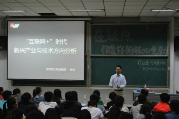 唐总监以自身经历为切入口,向同学们介绍了达内集团的成就和发展趋势。接着,唐总监围绕着"什么是互联网+"、"什么是大数据"、"互联网+和大数据的用途"几个问题为同学们进行了专业讲解。他说,以互联网为代表的IT行业是今天的新兴战略产业,永远都有新机会、永远都有新发展、永远都有新热点是这个行业的三大特点,所以这也是一个充满朝气,非常适合年轻人的行业。而大数据作为预测未来的技术,是我们在新时代的新机会。