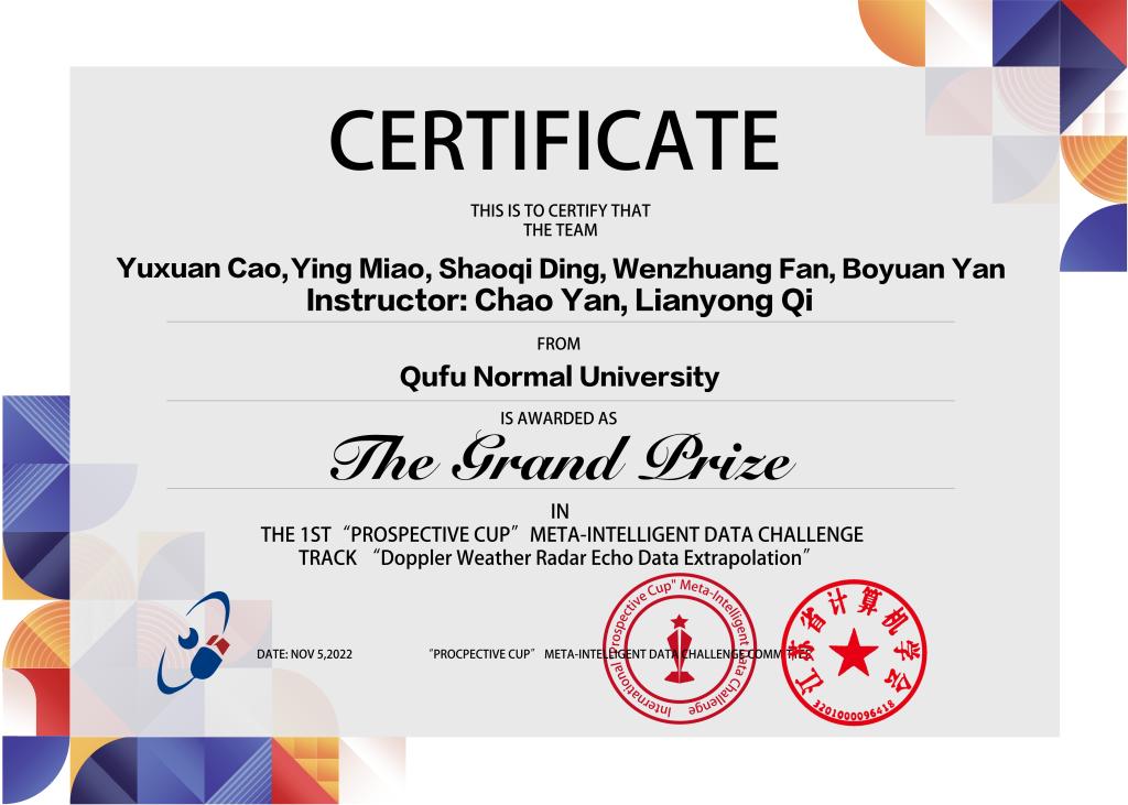 曲阜师大新闻中心讯 近日,由第十二届计算机工程与网络国际会议(CENet2022)发起的首届国际“远见杯”元智能数据挑战大赛(中国科协欧洲(比利时)海智创新创业基地、江苏省计算机学会主办)在海南省海口市落下帷幕。大赛采取赛道制,分为“火灾下混凝土温度孔压时空演化学习”、“音乐驱动的指挥动作生成”、“沉积学知识图谱中实体识别”、“多普勒天气雷达回波数据外推”四个赛道。其中,由开元足球_开元(中国)计算机学院闫超、齐连永老师指导,曹宇轩、苗影、丁少奇、樊文壮和闫博远等研究生完成的参赛作品:A Doppler Weather Radar Echo Data Extrapolation Model Based on MultiConvARIMA,喜获大赛唯一特等奖(奖金1万元)。