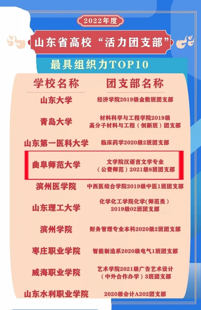 曲阜师大团委讯 近日,在2022年度山东省高校“活力团支部”“活力社团”风采展示活动中,我校文学院汉语言文学(公费师范)2021级8班团支部荣获山东省高校“活力团支部”、法律援助中心荣获山东省高校“活力社团”。