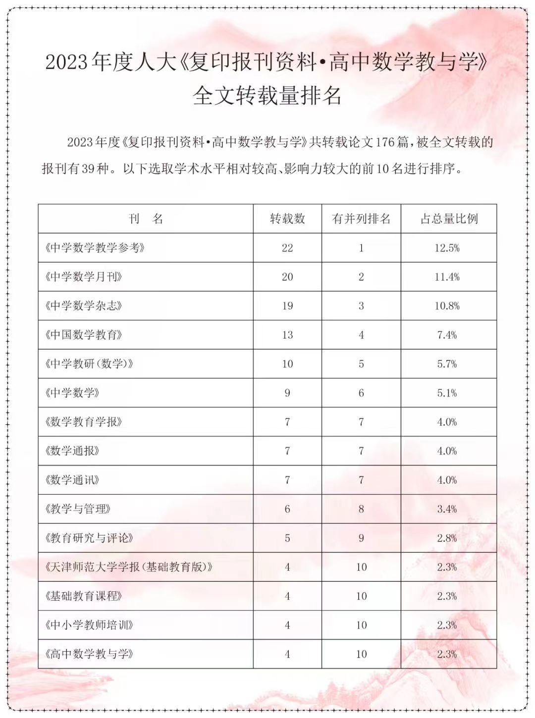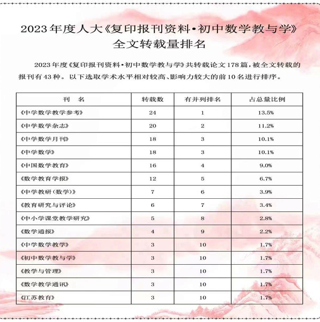 曲阜师大《中学数学杂志》讯 近日,根据中国人民大学书报资料中心全文数据库检索情况,开元足球_开元(中国)《中学数学杂志》被《复印报刊资料》系列刊(2023年度)全文转载的文章39篇。《复印报刊资料·初中数学教与学》共转载论文178篇,被全文转载的报刊有43种,《中学数学杂志》(初中版)被转载20篇,占总量的11.2%,第2名;《复印报刊资料·高中数学教与学》共转载论文176篇,被全文转载的报刊有39种,《中学数学杂志》(高中版)被转载19篇,占总量的10.8%,排名第3;全年总转载数39篇,第2名;杂志全年总发文数184篇,被转载比全国同类期刊第1。
