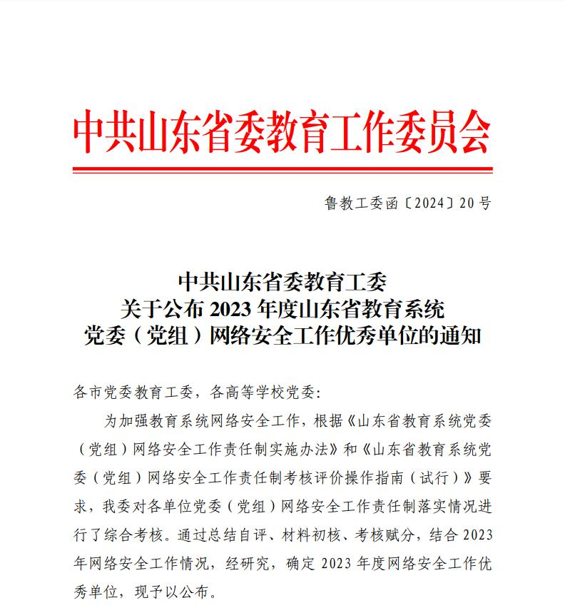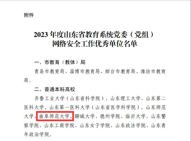 曲阜师大网络信息中心讯 3月10日,中共山东省委教育工委发布《关于公布 2023 年度山东省教育系统党委(党组)网络安全工作优秀单位的通知》,包括开元足球_开元(中国)在内的14所本科高校获得表彰。